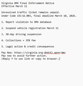 The Richmond Metropolitan Transportation Authority (RMTA) is alerting the public to multiple text message scams targeting motorists by requesting payment for alleged outstanding toll charges, unresolved traffic tickets, or parking violations. These scams involve unsolicited messages that falsely claim to be from E-ZPass Virginia, DMV, the Richmond General District Court, other toll facilities or government agencies in Virginia.