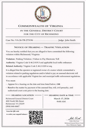 - Falsely Claimed Sources: Messages claim to be from E-ZPass, the DMV, the Richmond General District Court, or other tolling or government agencies