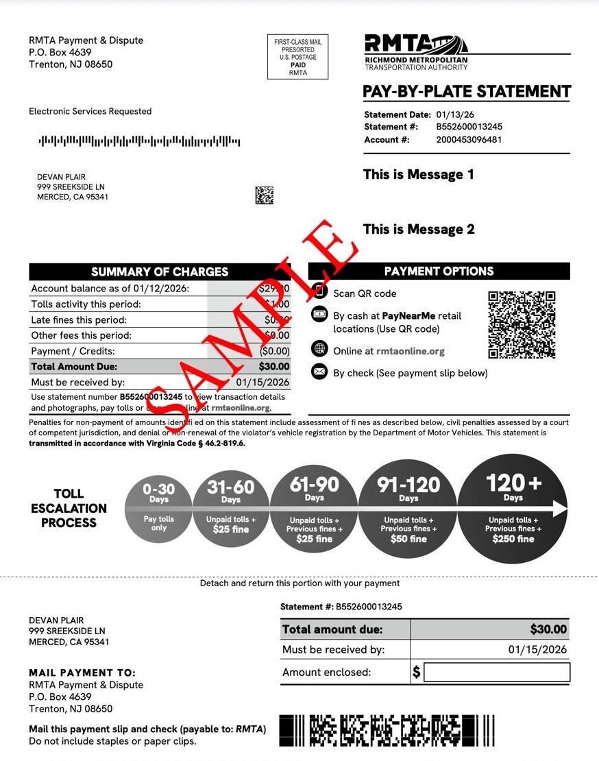 Receiving a statement simply means the vehicle traveled on the RMTA expressway system without using an E-ZPass. The transition to all-electronic tolling eliminated the need to pay cash. Tolls are now collected electronically as vehicles pass through an overhead structure known as a gantry. Statements are typically mailed twice a month after license plate information is verified.